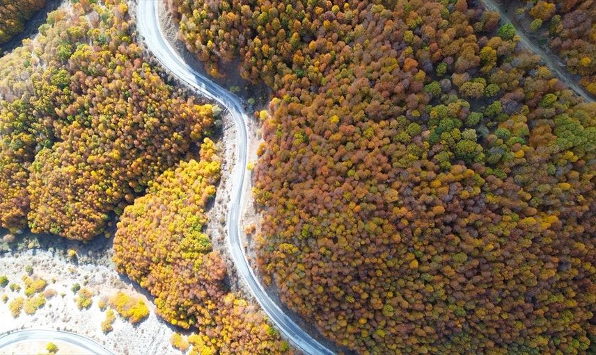 Yozgat'ın Aydıncık ilçesinde, yaklaşık 1550 rakımda bulunan Şebek Geçidi, sonbaharın gelmesiyle birlikte renk cümbüşüne büründü. Dronla çekilen görüntüler, bu muhteşem manzaranın nasıl bir tabloya dönüştüğünü gözler önüne serdi.
