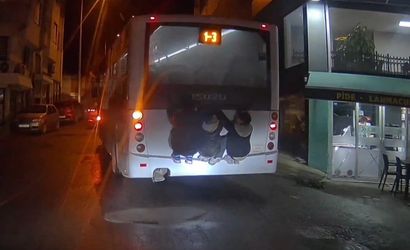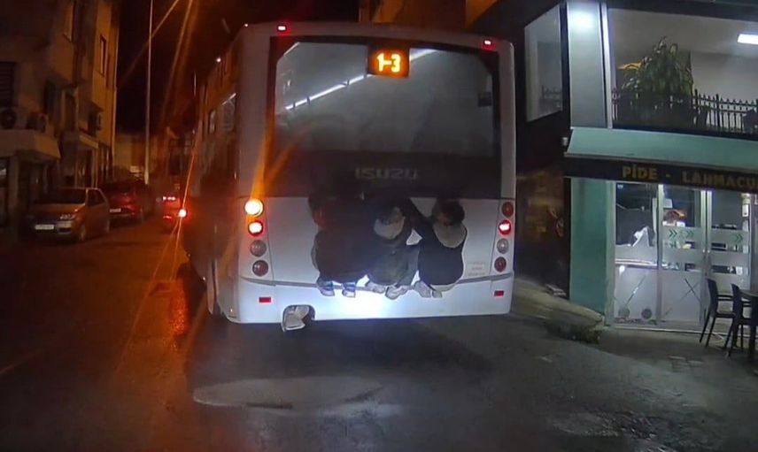 Yaşları küçük olan bu çocuklar, otobüsün arkasında tutunarak uzun bir süre yolculuk yaptı. Trafik akışının devam ettiği güzergahta hiç bir güvenlik önlemi alınmaması, durumu daha da riskli hale getirdi.