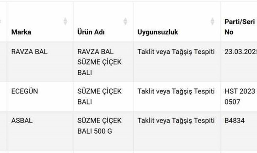 Bakanlık tarafından yayımlanan güncel listeye göre, Gümüşhane’nin Kelkit ilçesindeki ‘Ravza Bal - Mustafa Keleş’ firmasının ‘Ravza Bal Süzme Çiçek Balı’, Ankara’nın Akyurt ilçesindeki ‘Vahit Yıldız Balsu - Vahit Yıldız’ firmasının ‘Ecegün Süzme Çiçek Balı’ ve Bursa’nın Nilüfer ilçesindeki Asbal Gıda Turizm İnşaat Tekstil Sanayi ve Ticaret Ltd. Şti.'nin ‘Asbal Süzme Çiçek Balı 500 G’ ürünlerinde taklit yapıldığının belirlenmesi, tüketicileri endişeye sevk etti.
