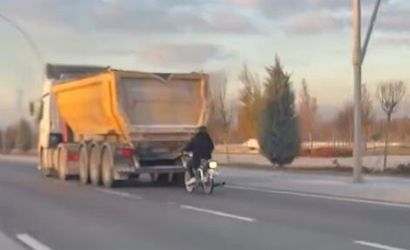 Konya'da, Seyir halindeki bir tırın arkasında ilerleyen motosiklet sürücüsünün yolu tehlikeye attığı anlar, başka bir araçta bulunanlar tarafından cep telefonu kamerasıyla kaydedildi.