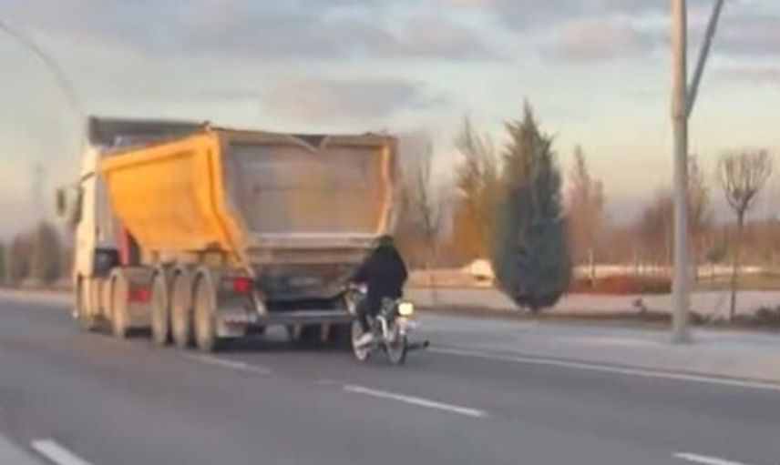Selçuklu ilçesinin Büyükkayacık Mahallesi, Ankara Caddesi üzerinde meydana gelen bu olay, seyir halindeki hafriyat tırının peşinden motosiklet sürücüsünün tehlikeli bir şekilde takip etmesiyle başladı. Motosiklet sürücüsü, zaman zaman tırın dorsesine oldukça yakın bir mesafede ilerleyerek izleyenlere korku dolu anlar yaşattı.