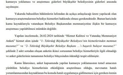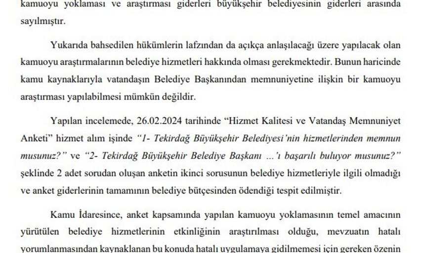 26 Şubat 2024 tarihinde yürütülen "Hizmet Kalitesi ve Vatandaş Memnuniyet Anketi" kapsamında, Tekirdağ halkına iki soru yöneltildi. İlk soru, “Tekirdağ Büyükşehir Belediyesi’nin hizmetlerinden memnun musunuz?” şeklindeyken, ikinci soru “Tekirdağ Büyükşehir Belediye Başkanını başarılı buluyor musunuz?” oldu. Sayıştay, ikinci sorunun belediye hizmetleriyle hiçbir ilgisi bulunmadığını vurguladı.