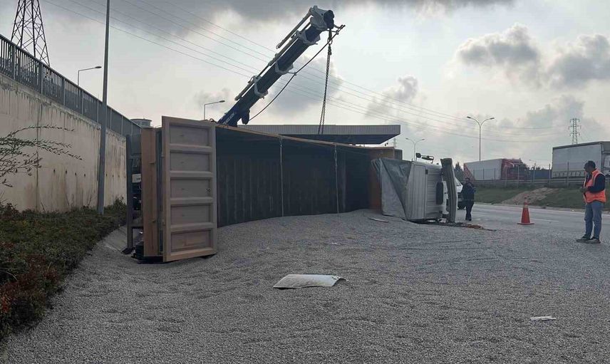 TEM Otoyolu'nda Devrilen Mıcır Yüklü Kamyon