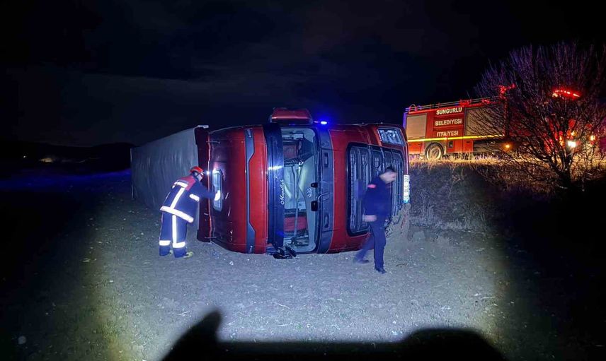Çorum’un Sungurlu ilçesinde, yola aniden çıkan bir köpeğe çarpmamak için manevra yapan sürücü, tırın kontrolünü kaybederek aracı şarampole devirdi. Olayda tır sürücüsü yaralandı.