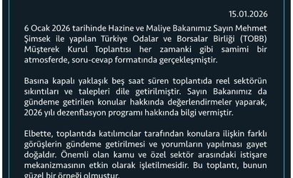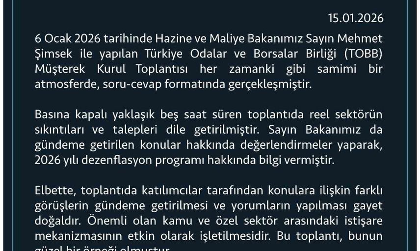 TOBB tarafından yapılan açıklamada, "Toplantıda katılımcılar tarafından konulara ilişkin farklı görüşlerin gündeme getirilmesi ve yorumların yapılması gayet doğaldır" ifadelerine yer verildi. Ayrıca, kamu ve özel sektör arasında istişare mekanizmasının etkinliğinin önemine vurgu yapıldı.
