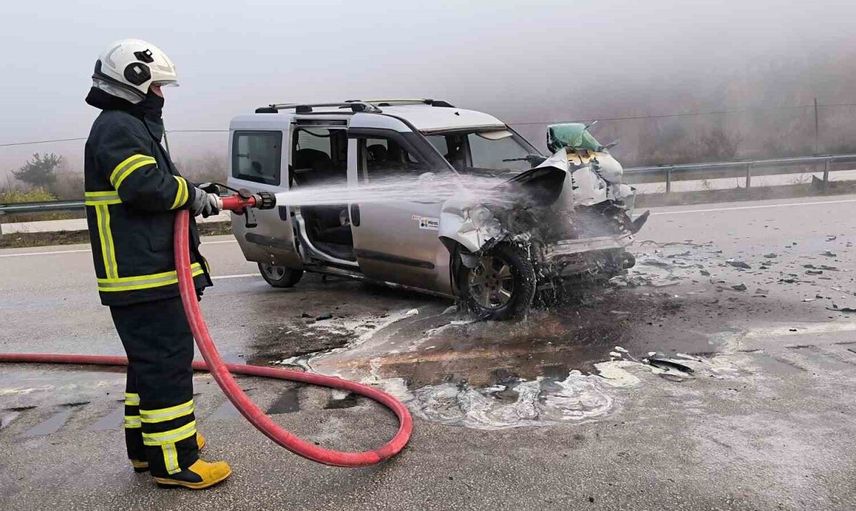 Kaza nedeniyle hafif ticari aracın motor kısmında yangın çıktı. İtfaiye ekiplerinin hızlı müdahalesi ile alevler söndürüldü, ancak araç kullanılamaz hale geldi.