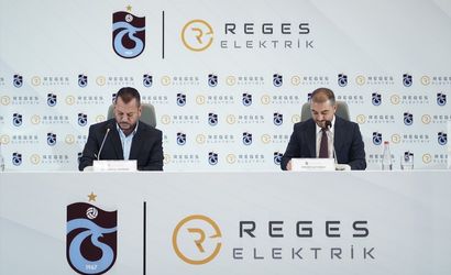 Trabzonspor ile Reges Elektrik arasındaki futbol takımı forma kol altı sponsorluğu anlaşmasının imza töreni, Raffles Otel'de gerçekleştirildi. Trabzonspor Kulübü Başkanı Ertuğrul Doğan (solda) ile Reges Elektrik Yönetim Kurulu Üyesi Enver Altuncu (sağda) sponsorluğa imza attı.