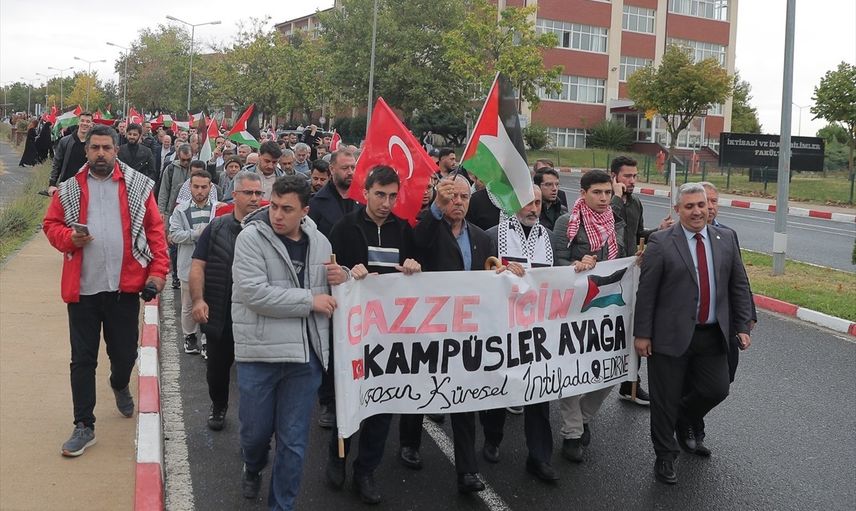 Trakya Üniversitesi'nde (TÜ), Özgürlük Filosu Koalisyonu'na destek amacıyla "Gazze İçin Umut, İnsanlık İçin Onur Yürüyüşü" düzenlendi.