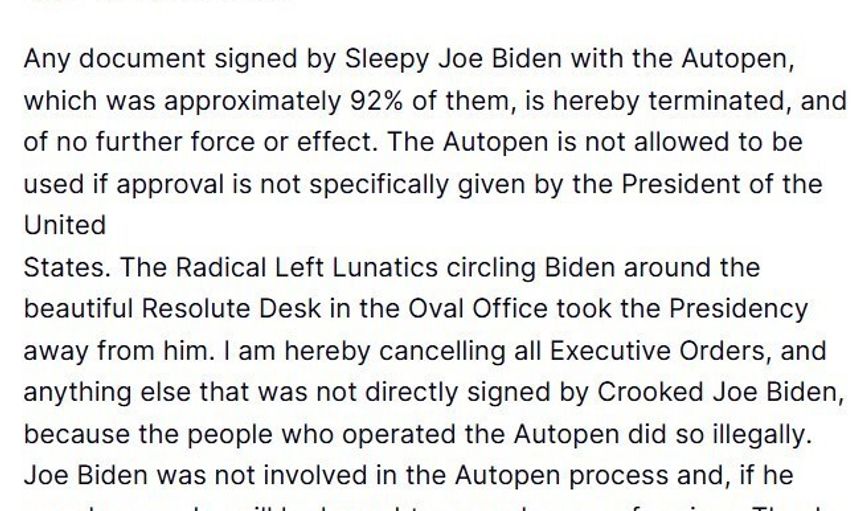 Trump, "Sahtekar Joe Biden tarafından doğrudan imzalanmamış olan tüm başkanlık kararnamelerini ve resmi belgeleri iptal ediyorum" dedi. Ayrıca, Biden döneminde imzalanan belge sayısının yaklaşık %92'sinin gerçek imza yerine 'Autopen' kullanılarak yapıldığını savundu.