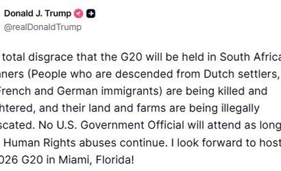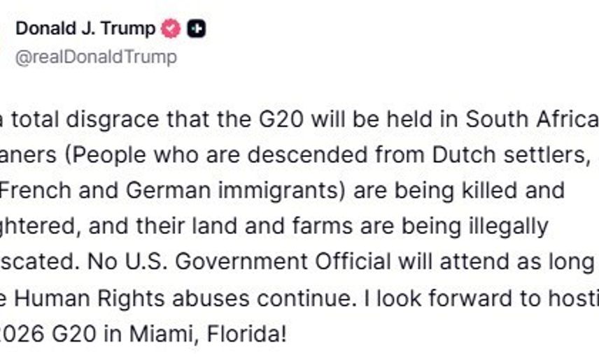 Açıklamalarını kendi Truth sosyal medya platformunda yapan Trump, Güney Afrika'da beyaz kökenli bireylere yönelik şiddet olaylarına dikkat çekti. Afrikanerlerin öldürüldüğünü ve topraklarına yasadışı şekillerde el konulduğunu ifade eden Trump, "Bu insan hakları ihlalleri devam ettiği sürece hiçbir ABD hükümet yetkilisi toplantıya katılmayacak" dedi.