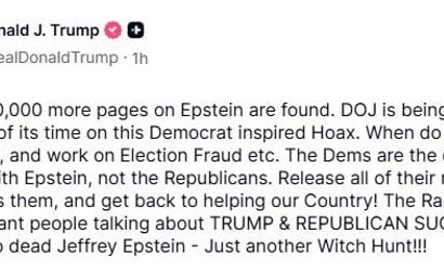 Trump, Epstein ile ilişkisi bulunanların Demokratlar olduğunu savunarak, bakanlık yetkililerine çağrıda bulundu: "Hepsinin isimlerini açıklayın, ifşa edin ve gerçekten ülkemize hizmet etmeye geri dönün." Bu yorumları, Epstein ile ilgili olarak 1 milyon sayfa yeni belgenin bulunduğu haberiyle çerçevelendi.