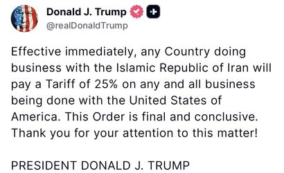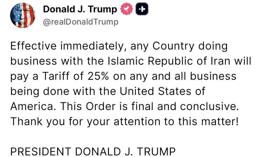 Trump, kendi sosyal medya platformu Truth üzerinden yaptığı duyuruda, "Derhal yürürlüğe girmek üzere, İran İslam Cumhuriyeti ile iş yapan herhangi bir ülke, ABD ile gerçekleştirdiği her türlü ticari faaliyette yüzde 25 gümrük vergisi ödemekle yükümlü olacaktır" ifadelerine yer verdi.