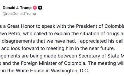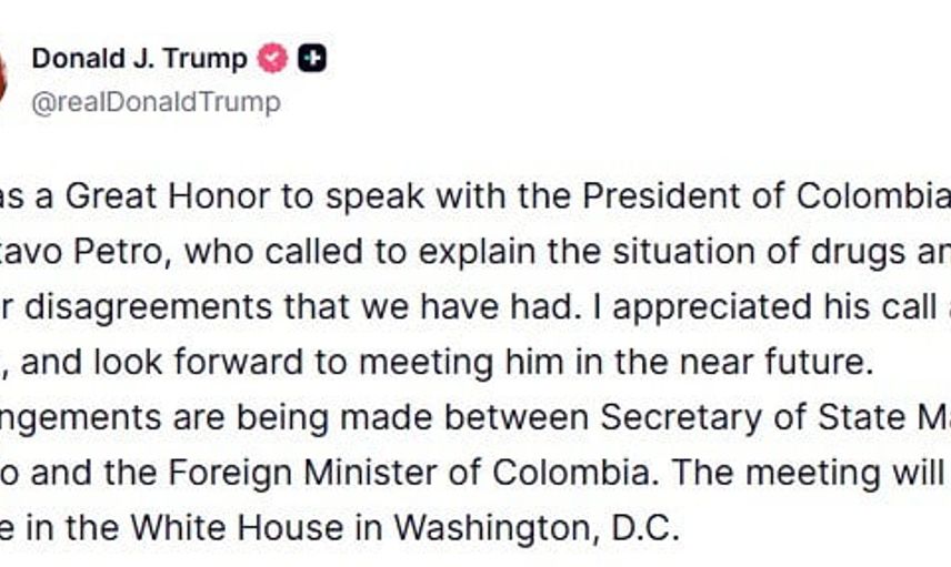 ABD Başkanı Donald Trump, Kolombiya Devlet Başkanı Gustavo Petro ile gerçekleştirdiği telefon görüşmesini kamuoyuna duyurdu. ''Beni aramasını ve üslubunu takdir ettim. Yakın gelecekte kendisiyle görüşmeyi sabırsızlıkla bekliyorum''