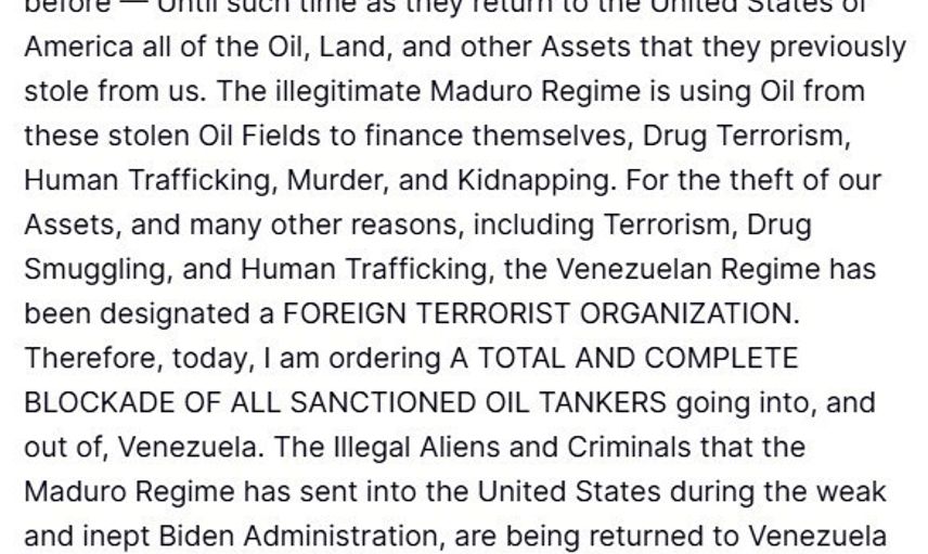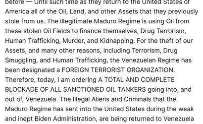 ABD Başkanı Donald Trump, Venezuela hükümetini "Yabancı Terör Örgütü" olarak tanımladığını açıkladı. Bu çerçevede, Venezuela’ya giriş ve çıkış yapan tüm yaptırıma tabi petrol tankerlerine tam ve kapsamlı bir abluka emri verdim.