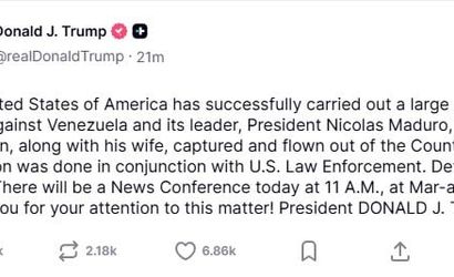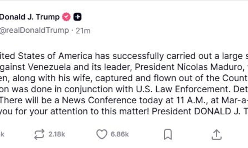 Trump, "ABD, Venezuela ve lideri Devlet Başkanı Nicolas Maduro’ya karşı geniş çaplı bir saldırı düzenleyerek Maduro ile eşini yakalamayı ve ülkeden çıkarmayı başardı. Bu operasyon ABD kolluk kuvvetleri ile iş birliği içinde gerçekleştirildi" ifadelerini kullandı.