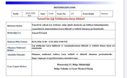 Meteoroloji 13. Bölge Müdürlüğü, Tunceli'de çığ tehlikesine dikkat çekti. Yapılan resmi açıklamada, "Tunceli’de yüksek kar örtüsüne sahip eğimli alanlarda çığ tehlikesinin bulunduğu belirtiliyor. Bu nedenle, yaşanabilecek olumsuzluklara karşı vatandaşların dikkatli ve tedbirli olmaları gerekmektedir."