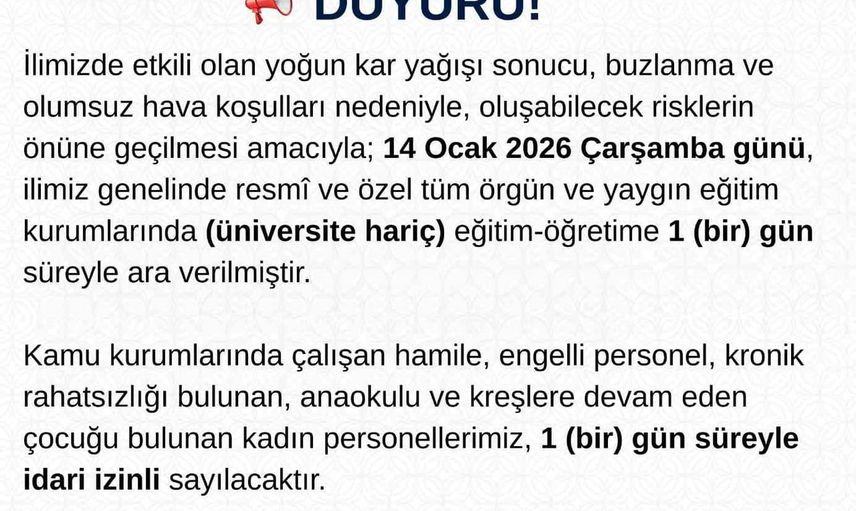 "İlimizde etkili olan yoğun kar yağışı sonucu, buzlanma ve olumsuz hava şartları nedeniyle, oluşabilecek risklerin önüne geçilmesi amacıyla; 14 Ocak 2026 Çarşamba günü, ilimiz genelinde resmî ve özel tüm örgün ve yaygın eğitim kurumlarında (üniversite hariç) eğitim-öğretime 1 gün süreyle ara verilmiştir."