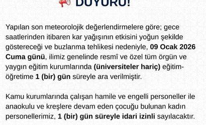 Açıklamada, "Yapılan son meteorolojik değerlendirmelere göre gece saatlerinden itibaren kar yağışının etkisini yoğun şekilde göstereceği ve buzlanma tehlikesi nedeniyle, 9 Ocak 2026 Cuma günü, ilimiz genelinde resmi ve özel tüm örgün ve yaygın eğitim kurumlarında (üniversiteler hariç) eğitim-öğretime 1 gün süreyle ara verilmiştir." ifadesine yer verildi.