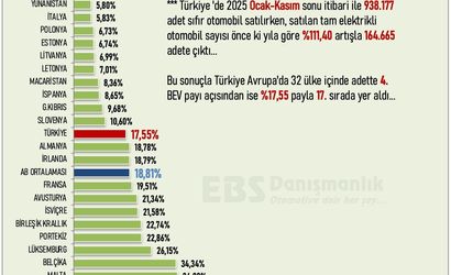 Ocak-Kasım döneminde elektrikli otomobillerin Türkiye'deki toplam otomobil satışları içindeki payı %17,55 olarak tespit edildi. Avrupa ortalaması %18,81 iken, Türkiye’nin 2026 yılında elektrikli araç tercihinin %20’nin üzerine çıkması bekleniyor.