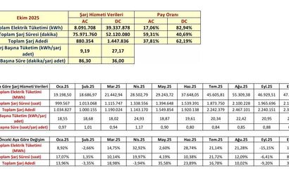 EPDK'nın verilerine göre, ekim ayı boyunca 36 bin 361 adet şarj noktasında toplam 2 milyon 328 bin 190 adet şarj işlemi gerçekleştirildi. Bunlar sonucunda toplam 47 bin 429 megavat düzeyinde elektrik tüketimi kaydedildi.