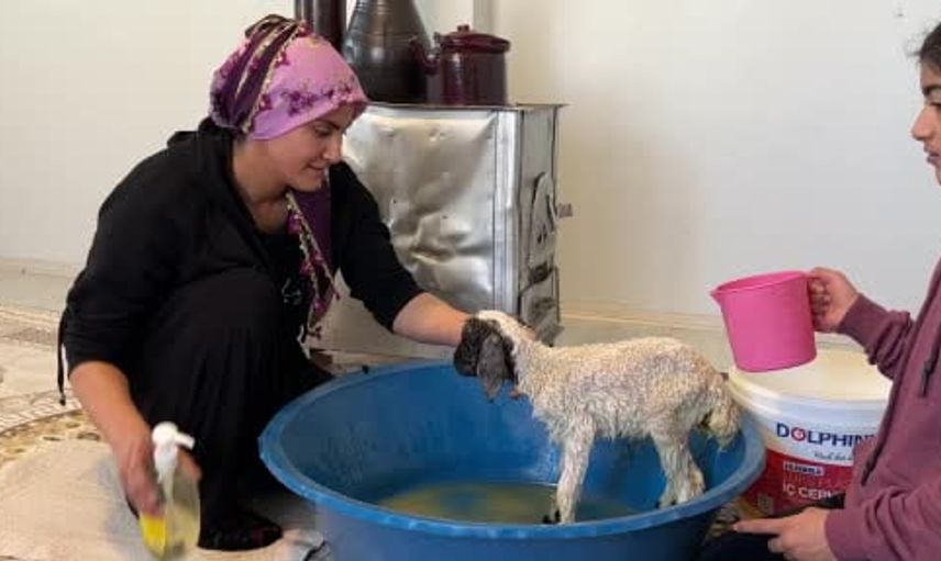 HAKKARİ'NİN YÜKSEKOVA İLÇESİNDE ANNESİ ÖLEN VE ‘UMUT’ İSMİ VERİLEN 10 GÜNLÜK KUZU, EV ORTAMINDA BEBEK ŞAMPUANIYLA YIKANIP BİBERONLA BESLENİYOR.