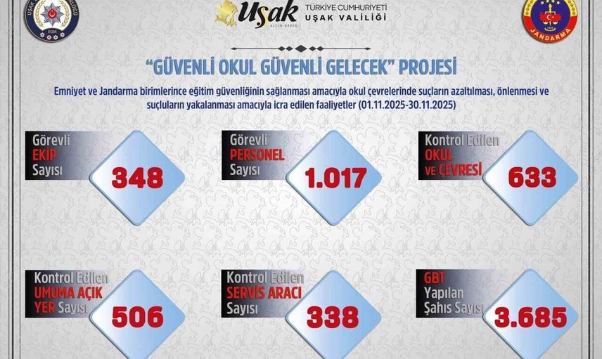 1 Ekim ile 30 Ekim tarihleri arasında sürdürülen denetimlerde, Uşak İl Emniyet Müdürlüğü ve İl Jandarma Komutanlığı bünyesindeki toplam 348 ekip ve 1,017 personel görev aldı. Denetimler sırasında 633 okul çevresi, 506 umuma açık mekan ve 338 okul servis aracı kontrol edildi. Ayrıca, kontrol edilen yerlerde 3,685 kişi sorgulandı.