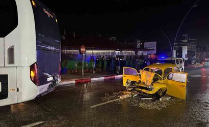 Alınan bilgilere göre, Gazi Bulvarı üzerinde seyir halindeki M.A. (36) kontrolündeki 34 CVG 008 plakalı otomobil, Günsazak Caddesi'ne dönüş yapmak isteyen A.Ç. (27) yönetimindeki 34 VTT 39 plakalı orkestra otobüsü ile çarpıştı.