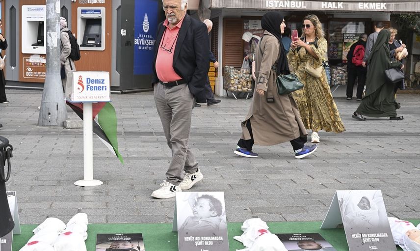 Deniz Feneri Derneğince, Gazze'deki insanlık dramına dikkati çekmek ve mazlumların sesi olmak amacıyla düzenlenen "İzlemek Yetmez" etkinliği ikinci gününde devam ediyor. Mihrimah Sultan Camisi önünde düzenlenen etkinlik kapsamında açılan, Gazze'de bombardıman altında şehit olan çocukların fotoğraflarının ve yanında simgesel kanlı bebek kefeninin yer aldığı sergi ziyaret ediliyor.