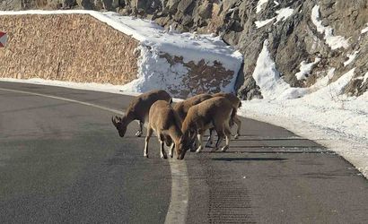 Bu kez bir aile, Bayburt-Gümüşhane kara yolunda ilerlerken nesli tükenme tehlikesi altında olan dağ keçisi sürüsüyle karşılaştı. Araçlarını durdurarak, bu nadir yaban hayvanlarını izlemeye başlayan aile, o anları cep telefonlarıyla kaydetti.