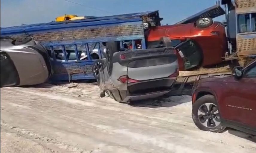 SIFIR ARAÇLARIN YÜKLÜ OLDUĞU TIRIN DEVRİLMESİYLE MİLYONLUK ARAÇLAR HASAR GÖRDÜ