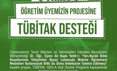 “YARI-KURAK İKLİM KOŞULLARINDA YETİŞTİRİLEN BEYAZ LAHANADA MAKİNE ÖĞRENMESİ MODELLERİ KULLANILARAK BİTKİ SU STRES İNDEKSİNİN TAHMİN EDİLMESİ” BAŞLIKLI PROJESİ, TÜBİTAK 1002-A HIZLI DESTEK PROGRAMI KAPSAMINDA DESTEKLENMEYE HAK KAZANDI.