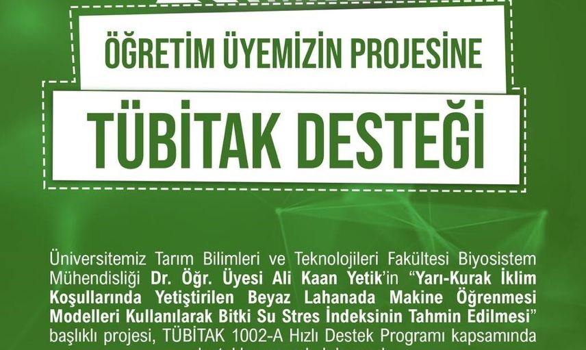 Niğde Ömer Halisdemir Üniversitesi Tarım Bilimleri ve Teknolojileri Fakültesi Biyosistem Mühendisliği Bölümünden Dr. Ali Kaan Yetik’in yürütücülüğünde hazırlanan "Yarı-Kurak İklim Şartlarında Yetiştirilen Beyaz Lahanada Makine Öğrenmesi Modelleri Kullanılarak Bitki Su Stres İndeksinin Tahmin Edilmesi" başlıklı proje, TÜBİTAK 1002-A Hızlı Destek Programı kapsamında desteklenmeye hak kazandı.