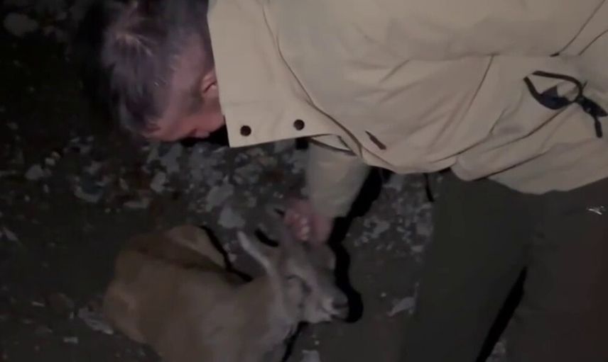 Erzurum'un Uzundere ilçesi, Pehlivanlı Mahallesi'nde meydana gelen olayda, yol kenarında yaralı halde bulunan bir yaban dağ keçisi, iki genç tarafından kurtarılmaya çalışıldı.