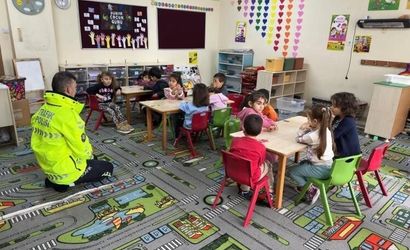 75. Yıl Cumhuriyet İlköğretim Okulu’nda öğrenim gören anaokulu öğrencilerine, İlçe Emniyet Amirliği personeli tarafından trafik müfredatı çerçevesinde eğitim verildi. Eğitimin içeriğinde, trafikteki temel davranışlar, trafik kuralları ve uyulması gereken güvenlik kuralları gibi konular yer aldı.