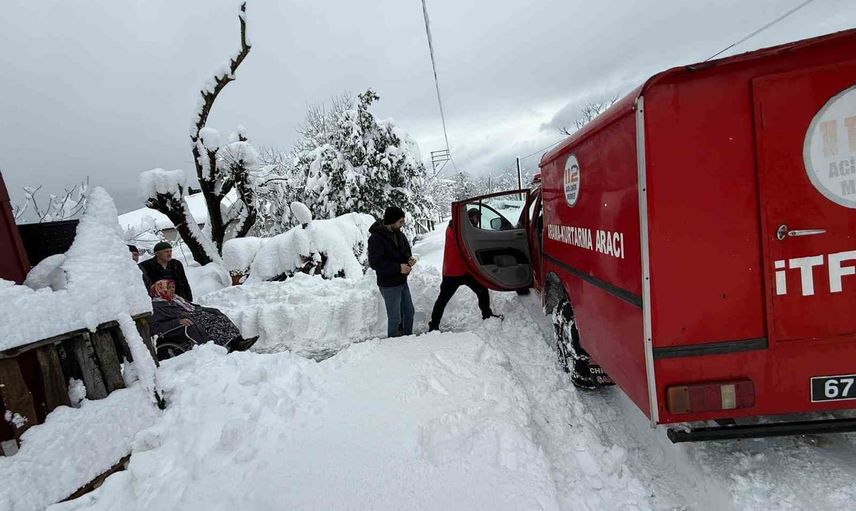 Durumun ciddiyeti üzerine Kozlu Belediyesi İtfaiye Müdürlüğü ekipleri, karla kaplı yolda arazi aracıyla yola çıktı. Zorlu kış koşullarına rağmen köye ulaşmayı başaran ekipler, yaşlı kadını güvenli bir şekilde araca nakletti.