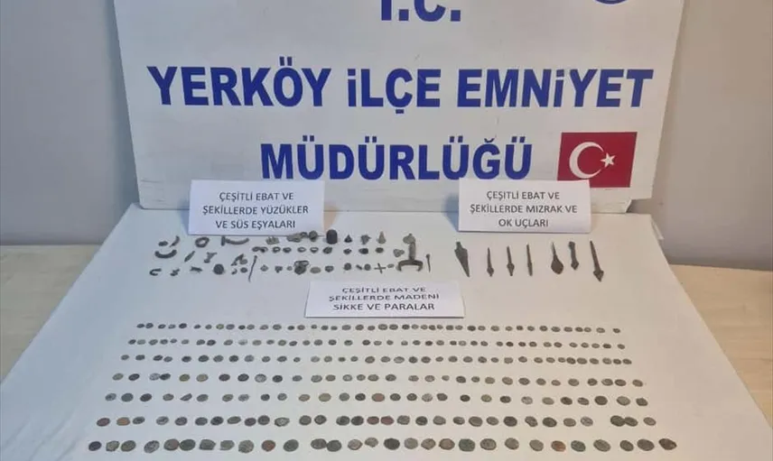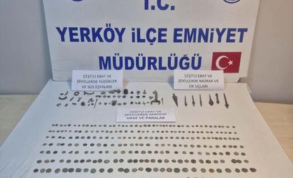 Yozgat'ın Yerköy ilçesinde gerçekleştiren operasyonda, çeşitli dönemlere ait tarihi eser niteliğinde olduğu değerlendirilen 328 sikke ve 56 obje bulundu. Olayla ilgili 1 şüpheli gözaltına alındı.