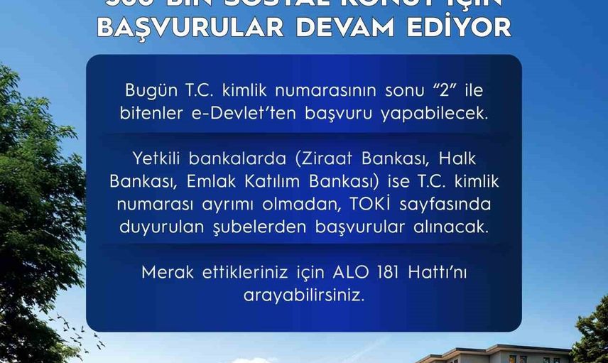 Yetkili bankalarda kimlik numarası ayrımı olmadan, TOKİ'nin belirttiği şubelerden başvurular kabul edilecek. Vatandaşlar, hangi bölgede hangi bankanın hizmet sunduğunu TOKİ’nin resmi internet sitesinden öğrenebilecek. Ayrıca, ALO 181 hattı üzerinden de sorularına yanıt bulabilecekler.