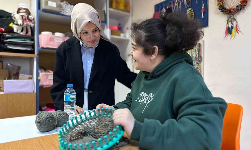 Zeynep Sözer, ziyaret sırasında merkezdeki hizmet alan engelli bireylerle birebir ilgilenerek yürütülen çalışmalara dair bilgi aldı.